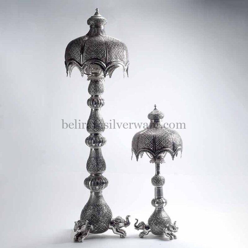 Another creation bestowing the regal aesthetics, these fascinating silver lamps have the finest intricacy on their outer bodies. Adorning dainty interwoven pattern all over it, the lamp stands on sturdy elephant legs. To accent snug corners of your home, this vintage artefact is an ideal one. The authenticity of this souvenir makes it a commendable investment for the future, too.